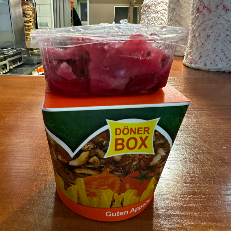 Mięso, frytki, kapusta, sos + marchewką po koreańsku, abo pelyustką, abo sate.