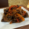 Mięso, frytki, sos + marchewką po koreańsku, abo pelyustką, abo sate bakłażan.